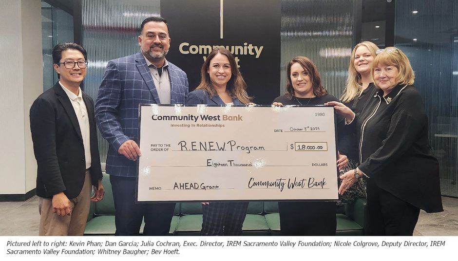 Community West Bank, in partnership with the Federal Home Loan Bank of San Francisco (FHLBank San Francisco), has awarded an $18,000 AHEAD Program grant to the Institute of Real Estate Management’s (IREM) Real Estate Networking Education & Work (RENEW) program to support workforce development in the Sacramento Valley.